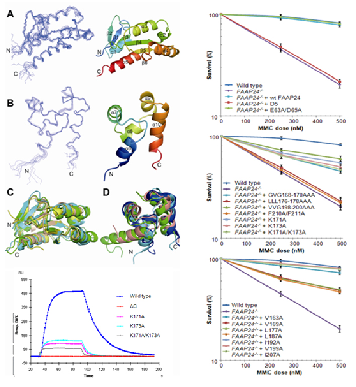 本研究在通过NMR手段解析了FAAP24溶液结构,结合序列分析和结构比对,找到了参与ssDNA结合的关键氨基酸残基G168, G170, K171 and K173,设计了一系列突变体通过体外SPR,NMR滴定实验对此进行验证,并通过体内实验进一步确定与染色质结合的氨基酸位点的正确性。通过截短体实验确定FAAP24-(HhH)2结构域对ssDNA以及FANCM的结合的关键性作用。该研究揭示了FAAP24在DNA损伤修复中的双重功能,进一步阐明了FA蛋白参与DNA损伤修复的分子机制。