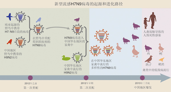 图示:新型流感H7N9病毒产生的两次重配过程。