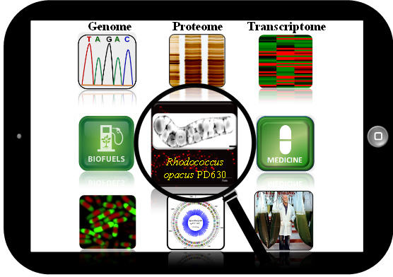 图示:利用组学对产油菌Rhodococcus opacus PD630脂滴代谢的研究和应用 。图片来源:(从左至右从上至下)1,自画;2和3,原文图片;4,google图片biofuel;5,W?ltermann, J Bacteriol, 2005, 187: 3607–3619产油菌电镜图片;6,自画;7,产油菌荧光图片;8,Cyanobase网站蓝藻基因组图片;9,J.Craig Venter在能源藻类实验室。