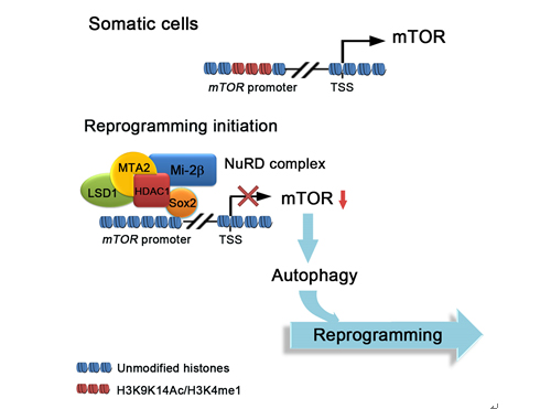 范祖森课题组研究发现,自噬过程对于iPSC的诱导形成至关重要。在iPSC 诱导过程中,自噬缺陷的Atg5-/-MEF无法启动干性基因的表达,不能产生iPSC细胞, 也不能形成畸胎瘤。在重编程诱导过程中,自噬发生在诱导的第一天,在诱导的第二天达到高峰。该课题组还发现Sox2能够在重编程的早期下调mTOR的表达,并且启动自噬。当Sox2缺失时,mTOR的mRNA和蛋白水平均保持不变,并且不能引起自噬的发生。该课题组进一步研究了Sox2调控mTOR表达的机制,鉴定了Sox2在mTOR 启动子上的结合区段。 通过TALEN技术将这一结合区段剔除后,能够抑制Sox2对于mTOR的转录水平的调控,从而抑制自噬的发生和iPSC的产生。重要的是,还通过Sox2结合mTOR 启动子的特异性序列,分离得到了与Sox2相互作用的染色质重塑NuRD复合物。NuRD复合物是介导组蛋白去甲基化和去乙酰化的抑制性复合物。将NuRD复合物的各个组分敲低以后,均能影响自噬的发生和iPSC的形成。该课题组通过对受精卵发育过程的研究,发现在4-8细胞期也存在着Sox2对于mTOR表达的抑制和自噬的发生,在Sox2缺失的受精卵中,无法通过下调mTOR启动自噬。综上所述,Sox2通过招募NuRD复合物参与自噬调节,在细胞重编程过程中发挥着至关重要的作用。