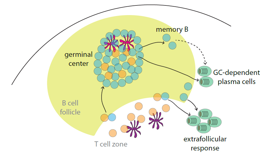 侯百东课题组利用Lyn基因缺陷的小鼠作为系统性红斑狼疮的动物模型,阐明了无论是B细胞自身的,还是来自树突样细胞的Toll样受体信号,都对抗核抗体的产生发挥作用,不过作用途径并不完全一样。更重要的是,该研究发现生发中心反应是抗核抗体生成的重要机制,而Toll样受体信号可能不只是促进了抗体分泌细胞的分化,同时也促进了生发中心反应的形成,从而进一步推动了自身反应性抗体的生成。生发中心反应在正常人体内是重要的抗病毒机制之一,而过去认为自身抗体的产生主要是在滤泡外进行的(见插图)。在狼疮患者中,究竟是哪一种机制发挥作用目前并不清楚,也将是该研究未来的目标。