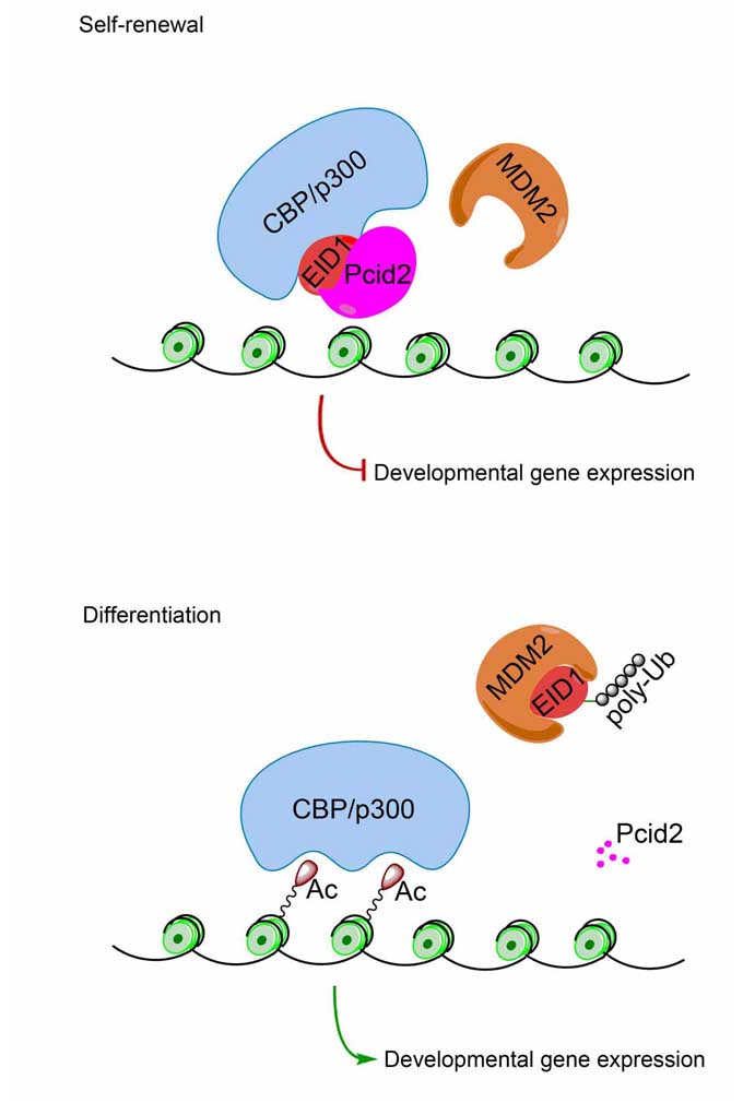 范祖森课题组研究发现,Pcid2基因敲除导致人和小鼠ES细胞失去干性,在体内失去三胚层分化能力。并且Pcid2基因敲除导致胚胎不能发育至囊胚期。该课题组进一步证实了Pcid2通过抑制ES细胞分化基因的表达而维持ES细胞的干性。通过酵母双杂交筛选和免疫共沉淀等实验体系,发现CBP/p300乙酰转移酶活抑制因子EID1与Pcid2相互作用,并共存在于CBP/p300复合体中。该课题组进一步研究发现,Pcid2与E3泛素连接酶MDM2竞争性结合EID1,抑制EID1的降解过程,阻断CBP/p300的乙酰转移酶活性和分化相关基因启动子区H3组蛋白Lys9及Lys14位乙酰化修饰,从而抑制ES细胞分化相关基因的表达。综上所述,Pcid2通过调控EID1的蛋白稳定性,抑制人及小鼠ES细胞发育相关基因表达,在ES细胞自我更新与分化的调控中发挥重要作用。该研究为理解ES细胞重编程机制提供了重要依据。