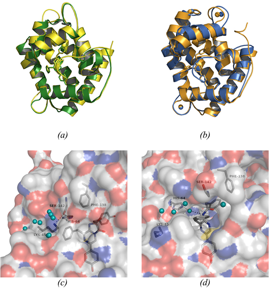 c. 非激发态突变体蛋白活性位点表面示意图(蓝绿色圆点代表水分子)