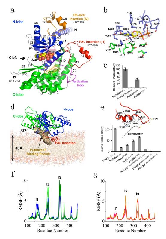 图a,hPI4KIIα催化核心ADP结合状态整体结构;图b,ATP结合口袋ADP与hPI4KIIα的相互作用;图c,ATP结合口袋重要氨基酸残基突变体激酶活性;图d,基于分子动力学模拟推测的PI结合口袋;图e,棕榈酰化插入片段突变体激酶活性测定;图f和g,hPI4KIIα没有被棕榈酰化修饰(f)和被修饰(g)情况下的氨基酸残基构象变化