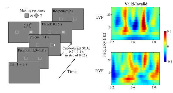 图示:采用高时间分辨率方式研究注意行为动态过程,发现了注意行为中的10-20 Hz的振荡现象,提出了一种基于神经振荡的多空间位置表征的神经机