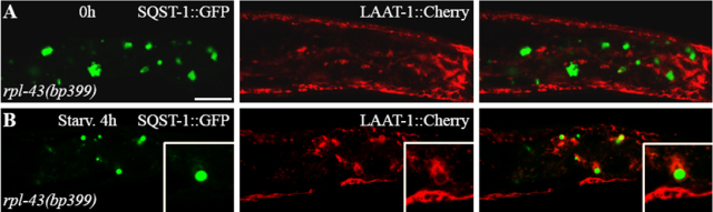 图1. rpl-43 突变体中累积的SQST-1蛋白聚集体可以被饥饿诱导的细胞自噬所降解
