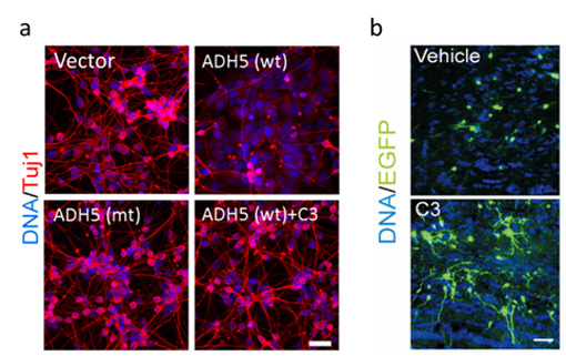 研究人员同时发现,向小鼠SVZ脑区注射ADH5特异的小分子抑制剂能有效增加嗅球区的新生神经元的数目。此外,ADH5抑制剂可以显著激活人神经干细胞向神经元的分化能力。由于衰老和神经退行性疾病往往伴随着脑内神经干细胞活力和神经新生的渐进性衰退,因此,针对ADH5活性的调节可能为干预衰老相关的神经再生障碍(如认知衰退和嗅觉减弱等)提供新的治疗思路。