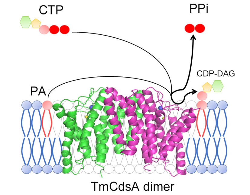 2014年6月27日,Nature communications期刊在线发表了中科院生物物理所柳振峰研究组报道的嗜热古菌Thermotogamaritima来源的胞苷二磷酸-二脂酰基甘油(CDP-DAG)合成酶(TmCdsA)的研究成果,题为“Structure and mechanism of an intramembraneliponucleotidesynthetase central for phospholipidbiosynthesis”。该项研究在国际上首次报道了CDP-DAG合成酶(Cds)膜蛋白家族的第一个晶体结构(分辨率为3.4埃),并对其活性中心的金属离子结合位点、双底物的结合位点及催化反应机制进行了深入分析和探讨。CDP-DAG合成酶广泛存在于原核生物和真核生物体内,是磷脂酰甘油(PG)、磷脂酰肌醇(PI)以及磷脂酰丝氨酸(PS)合成过程的重要中间酶。它所催化生成的产物CDP-DAG,被下游的其它酶用于合成PG,PI和PS。在体内,Cds蛋白被发现在磷脂酰肌醇介导的信号转导通路中的信使分子PIP2分子的循环再生中发挥关键作用,进而参与昆虫视觉反应中的光感受过程和鱼类的血管生成过程。并且,之前的研究还发现植物叶绿体中的Cds同源蛋白对于植物的光合自养是必需的。