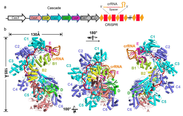 2014年8月12日,Nature杂志在线发表了中科院生物物理研究所王艳丽研究组关于CRISPR系统中Cascade复合物的研究进展,标题为“Crystal structure of the RNA-guided immune surveillance Cascade complex in Escherichia coli”。本文揭示了Cascade的晶体结构及其与RNA相互作用的方式。