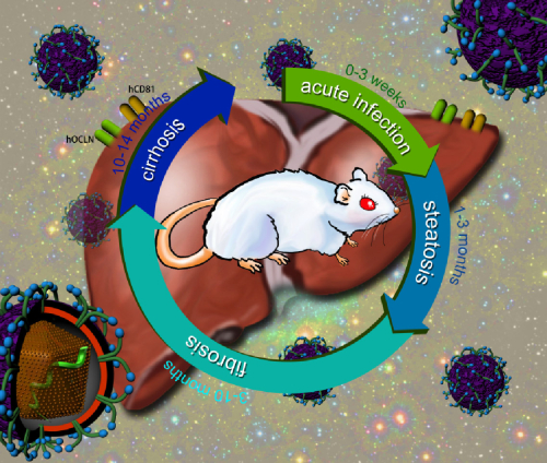 图示:HCV持续性感染小鼠模型的建立。使用转基因的方式将CD81, OCLN两个人的HCV受体表达在ICR小鼠肝脏中。这样的小鼠能够支持HCV持续性感染并表现出与人类似的丙型肝炎疾病进程:急性感染期-肝脏脂肪变性—肝脏纤维化—肝硬化。这是世界上首个HCV持续感染、完整反映HCV感染自然史和慢性病毒性肝炎进展的动物模型,将有力推动丙肝防治的疫苗和药物研发。