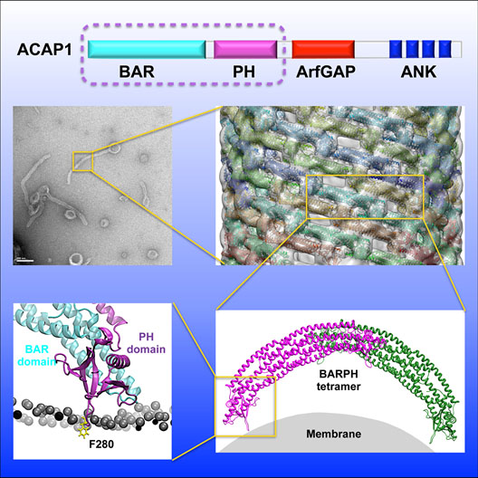 图示:ACAP1重塑细胞膜的分子机制。按照比例放大顺序:脂质体与BAR-PH孵育后的负染电镜图像;BAR-PH覆盖的管状结构的冷冻电镜密度图;BAR-PH螺旋结构在管状结构上的作用模型;分子动力学模拟PH结构域插入细胞膜的作用。