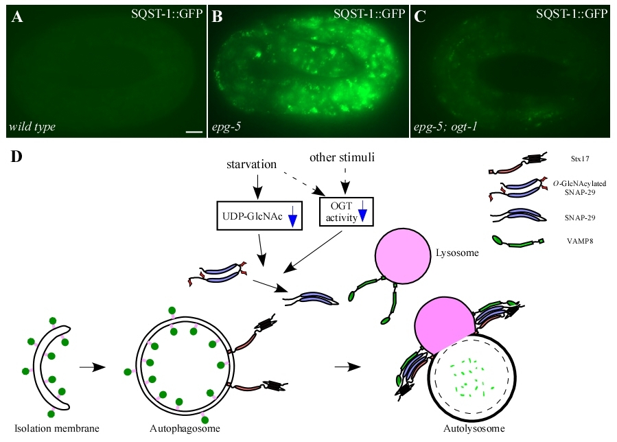 张宏实验室之前的遗传筛选研究发现了一个多细胞生物特异的细胞自噬基因epg-5/EPG5。在epg-5突变体中,细胞自噬结构大量累积。为了获得可能参与调节自噬小体成熟的相关基因,张宏实验室的研究人员进行了epg-5突变体的抑制子筛选。其中有一个突变体为bp815,遗传克隆发现它是ogt-1的一个等位基因。ogt-1编码哺乳动物细胞O-GlcNAc转移酶OGT的同源物。进一步研究证明线虫ogt-1的突变可以提高细胞自噬活性,从而促进蛋白聚集体的降解。哺乳动物细胞中,OGT敲减后可以显著促进细胞自噬降解过程。OGT功能缺失可以促进细胞自噬小体和内含体以及溶酶体的融合过程。进一步的体内和体外实验研究发现,参与细胞自噬小体成熟的SNAREs复合体组分之一的SNAP-29可以被OGT介导的O-GlcNAc糖基化修饰。O-GlcNAc修饰的SNAP-29可以抑制其与STX17以及VAMP8形成SNAREs功能复合体。在OGT敲减细胞中,SNAP-29的糖基化修饰水平显著降低,从而促进了STX17-SNAP-29-VAMP8复合体的形成,最终促进了细胞自噬小体的成熟。质谱分析和定点突变实验鉴定了SNAP-29中有四个氨基酸可以被OGT介导的O-GlcNAc糖基化修饰。过表达糖基化修饰位点突变的SNAP-29可以显著促进细胞自噬降解活性。同时,研究表明线虫SNAP-29也能够被O-GlcNAc糖基化修饰。在饥饿的线虫中,GlcNAc供体UDP-GlcNAc的水平显著下降,SNAP-29的O-GlcNAcylation修饰水平明显降低。这项研究工作首次报道了细胞自噬小体的成熟可以被营养状态感应因子OGT介导的SNAP-29的O-GlcNAc糖基化修饰所调节。这是继mTORC 和VPS34 复合体外,第三个能够感应细胞的营养状态从而调控自噬活性的节点。