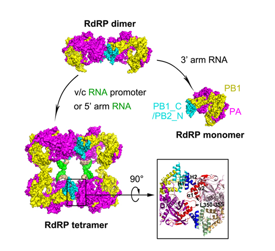 图注:A型流感病毒RNA聚合酶复合体四体总体结构及二体、四体、单体之间的转换(图作者:李军)