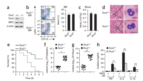 该课题组前期研究发现,Sox2作为重编程的重要转录因子,通过招募NuRD复合物参与自噬调节,在胚胎发育和细胞重编程过程中发挥着至关重要的作用(Wang S, et al. Cell Stem Cell, 2013)。为了进一步探究Sox2在骨髓干细胞发育中的作用,我们发现Sox2蛋白在嗜中性粒细胞的细胞质中高表达,而且在细菌感染的情况下,Sox2与入侵的细菌共定位,且呈现明显的斑点状分布。在粒细胞条件性敲除Sox2基因的小鼠抵抗细菌感染的能力显著降低,并且嗜中性粒细胞产生促炎症因子的能力明显下降,表明Sox2蛋白在抵抗细菌感染中发挥重要作用。