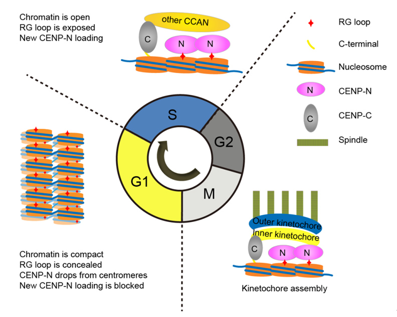 图例:着丝粒区CENP-A染色质高级结构的动态变化调控细胞周期中CENP-N的招募与装配。