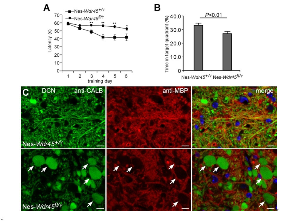 图示:Nes-Wdr45fl/Y小鼠出现学习记忆功能障碍和轴突水肿