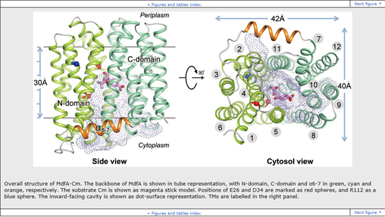 MdfA形成12次跨膜螺旋的拓扑结构,含有由3次跨膜螺旋重复结构形成的两个结构域,底物结合口袋位于两个结构域的界面处。通过突变实验,该研究组在细胞水平上对氯霉素的结合位点进行了研究,验证了多个对底物结合及质子化位点起关键作用的氨基酸残基。同时赵永芳组利用单分子荧光共振等方法验证了晶体结构中的观测。基于对该家族蛋白中多个保守的序列模体进行的结构和功能分析,文章作者提出了一个基于膜电位的、底物-质子逆向转运的分子机制,为进一步认识广谱性抗药转运蛋白的一般工作原理奠定了实验和理论基础。