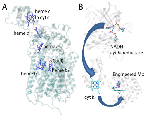 血红素-铜氧化酶是一类在呼吸链末端高效催化氧气还原为水的反应的金属酶。这类酶比现有的贵金属催化剂更有效。在前期成功设计基于肌红蛋白的氧化酶的基础上,王江云研究组(http://english.ibp.cas.cn/ibp_pi/W/201312/t20131212_114365.html)与美国伊利诺伊大学香槟分校Yi Lu课题组合作,将理性设计的氧化酶的酶活提高到了天然酶的水平。该研究引入NADH-细胞色素b5还原酶,细胞色素b5作为肌红蛋白的电子供体。并通过在基于肌红蛋白的氧化酶中引入三个将带负电的氨基酸换为带正电的赖氨酸的突变,将肌红蛋白和细胞色素b5之间的电子传递速率提高了400倍。通过构建NADH-细胞色素b5还原酶--细胞色素b5--基于肌红蛋白的氧化酶的电子传递通路,基于肌红蛋白的氧化酶的酶活从0.3s-1提高到了52 s-1,达到了天然的血红素-铜氧化酶的酶活(50 s-1)。