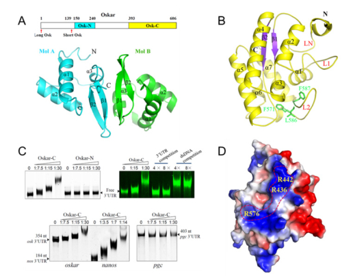 图例:Osk-N和Osk-C的晶体结构以及Osk-C与相关mRNA的3’-UTR的结合。(A). Osk-N二聚体的结构;(B). Osk-C的结构;(C). Osk-C结合相关mRNA的3’-UTR(D); (D). Osk-C表面与RNA结合的关键部位。