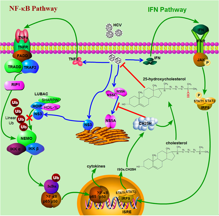 图:丙型肝炎病毒与宿主天然免疫系统之间的精彩博弈(Chen et al., Science Signaling 2015; Chen et al., Scientific Reports 2014)。
