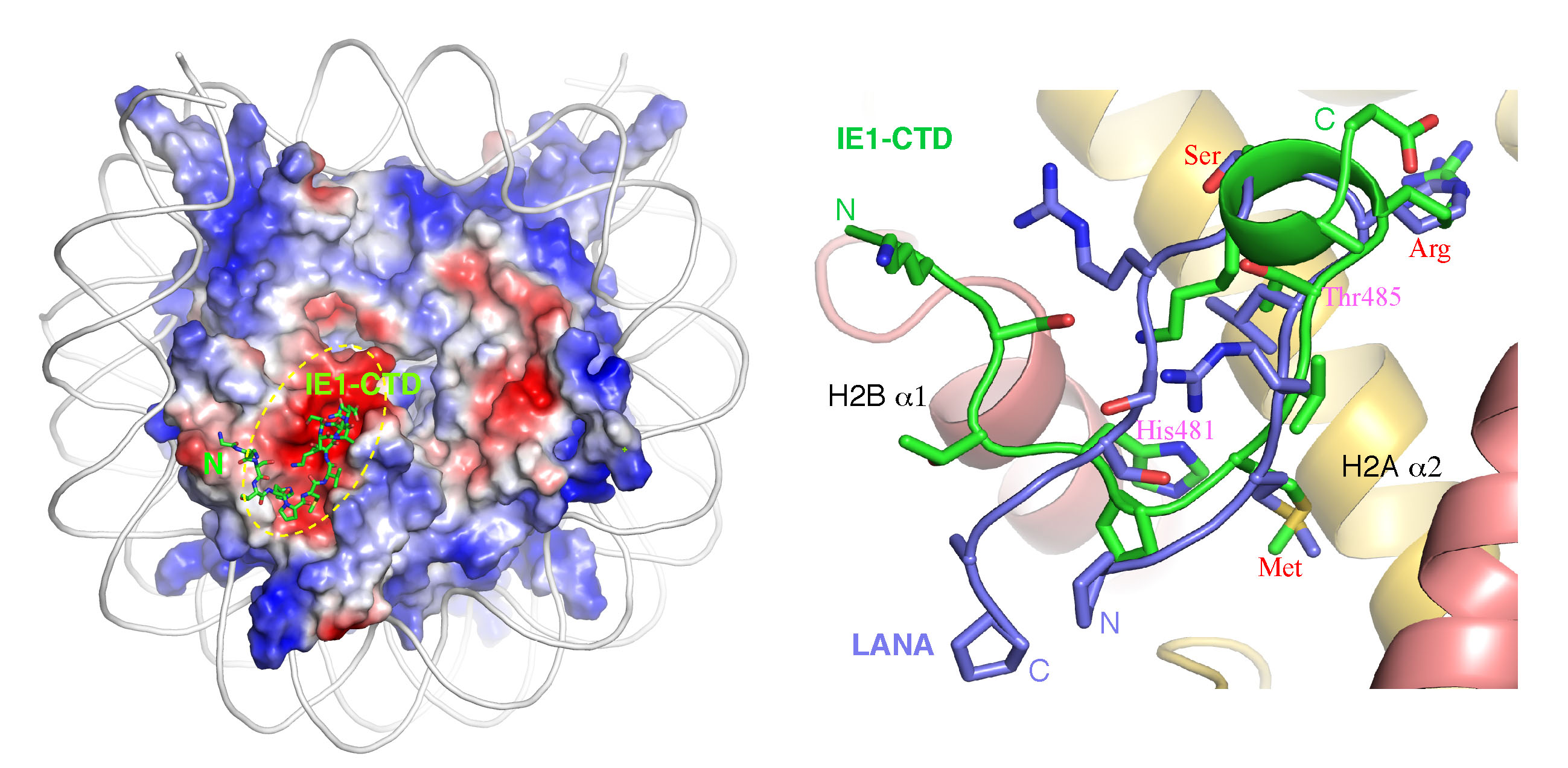 图例:IE1-CTD结合人核小体的结构图(左)以及IE1与另外一个病毒蛋白LANA结合核小体的不同方式的比较。