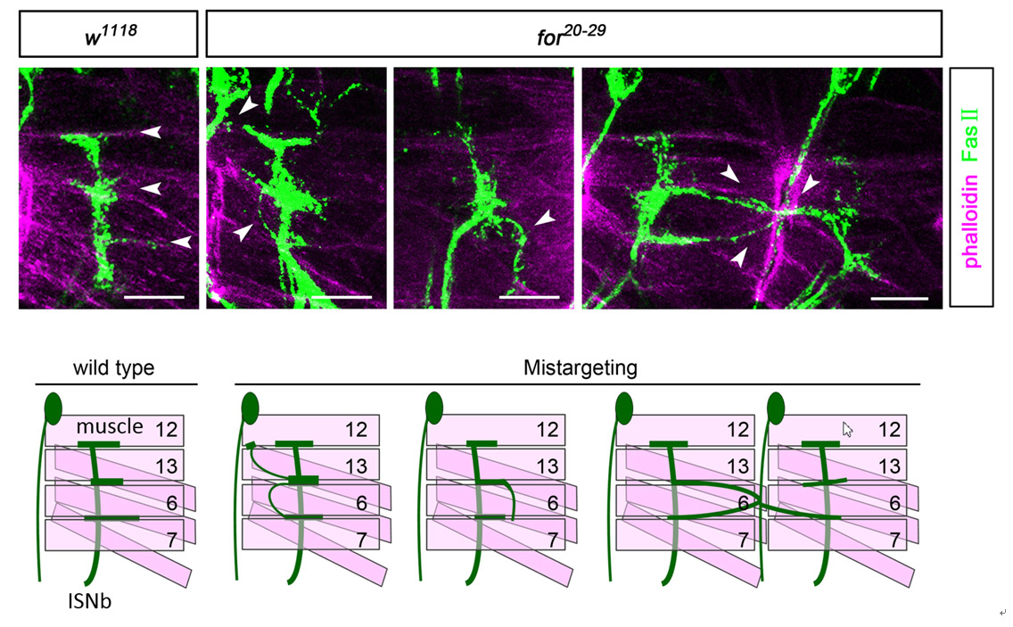 图1. for突变体ISNb运动神经元轴突投射缺陷。在w1118对照品系中,ISNb轴突与肌肉之间形成三个特定神经肌肉接点;在for纯合突变品系中(for20-29),ISNb轴突呈现不同的轴突投射缺陷。