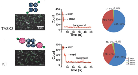 生物物理所和上海药物所的研究人员利用发展的单分子检测成像技术和“GVTDT,Graft VSD To Dimeric TASK3”的电压感受单元移植策略解决了这一困扰已久的问题。研究人员使用一种本身不包含电压感受单元的TASK3钾通道作为受体(host),而将不同电压门控钾通道看作提供电压感受单元的供体(donor),采用分子生物手段将供体的电压感受单元移植给受体,进而构建出含有两个甚至一个电压感受单元的新型人工通道。进一步,利用生物物理所自主搭建的单分子成像系统进行观察和定量分析,证明一个电压感受单元即可以有效调控电压敏感钾通道的开放和关闭。电压感受单元是很多药物的作用位点,靶向电压感受单元是发现亚型选择性调节剂和药物的有效途径之一。该项研究为发展作用于电压感受单元的选择性离子通道药物提供了新工具蛋白和新思路。