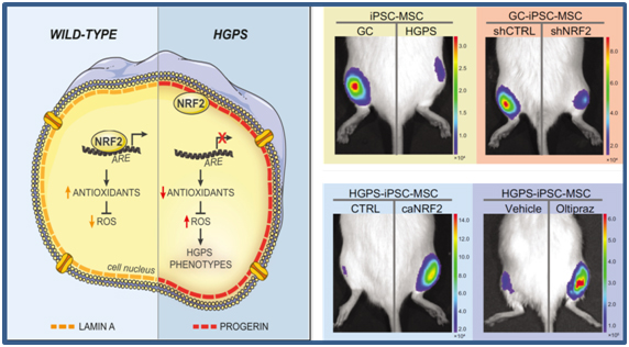 研究人员结合高通量RNA干扰筛选和高内涵生物成像,获得了NRF2抗氧化信号通路可以直接调控儿童早衰症细胞衰老这一线索。研究表明,异常表达的progerin与转录因子NRF2结合,并将其捕获锁定在细胞核膜上,使之无法正常激活下游抗氧化基因的表达,引起细胞的慢性氧化应激。在年轻的正常间充质干细胞中抑制NRF2的活性可以模拟儿童早衰症的多种加速衰老的细胞缺陷,而在儿童早衰症患者诱导多能干细胞(iPSC)衍生的间充质干细胞中重新激活NRF2可以有效逆转细胞加速衰老的表型。