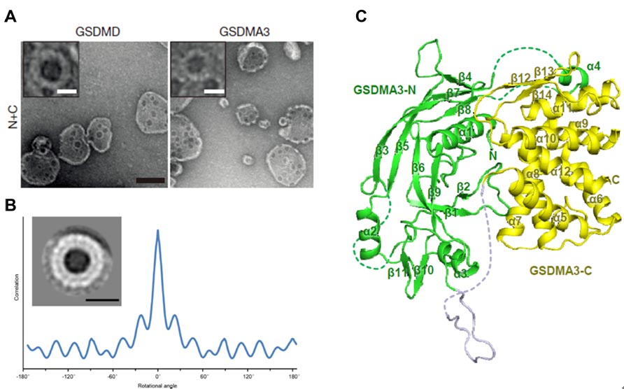 图示:A. gasdermin N端结构域能在脂质体上形成的蜂窝状孔道;B. gasdermin N端结构域在膜上形成的16元聚合体孔道;C. GSDMA3全长蛋白高分辨率晶体结构。