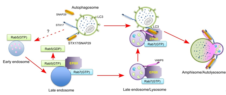 在该项目中,研究人员发现EPG5可以结合晚期内体/溶酶体上的蛋白质Rab7,从而特异地定位于晚期内体/溶酶体。同时,晚期内体/溶酶体上的R-SNARE蛋白VAMP7/8与EPG5也存在相互作用。另一方面,自噬小体上的蛋白质LC3/LGG-1,以及预组装的Qabc-SNARE复合物STX17-SNAP29也可以与EPG5结合,从而通过EPG5将自噬小体定位于晚期内体/溶酶体,以进行下一步融合。进一步的生化实验揭示,EPG5可以促进膜融合分子机器QabcR-SNARE复合物STX17-SNAP29-VAMP8的体外组装;体外的脂质体融合实验也表明EPG5可以促进STX17-SNAP29-VAMP8复合物介导的膜融合。综合上述现象和分子机制,研究人员认为,EPG5作为Rab7的效应蛋白,以“tether”的方式特异性介导自噬小体与晚期内体/溶酶体之间的融合。在缺乏EPG5的多细胞真核生物体内,自噬小体与某些错误错误的膜泡结构融合,引起溶酶体损伤,最终导致自噬缺陷。