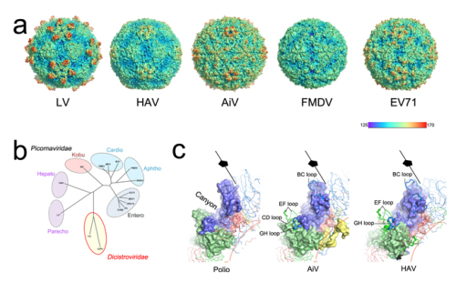 图一. AiV病毒的整体结构特征和基于结构的小RNA病毒进化分析