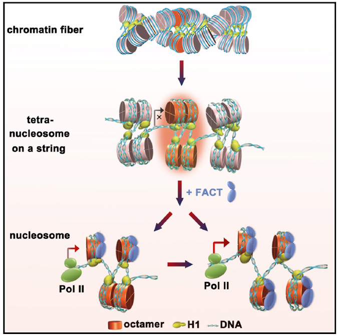 2016年9月22日,《Molecular Cell》杂志在线发表了中科院生物物理所李国红课题组与物理所李明课题组合作完成的、题为“FACT Remodels the Tetranucleosomal Unit of Chromatin Fibers for Gene Transcription”的研究文章。该研究工作利用单分子磁镊技术实时跟踪和解析了染色质纤维结构建立的动态过程和力学基础,发现了“四核小体”结构单元是染色质折叠过程中形成的一种稳定的中间状态;揭示了组蛋白伴侣FACT(Facilitates Chromatin Transcription)可以调控“四核小体”结构的稳定性,从而促进基因转录。
