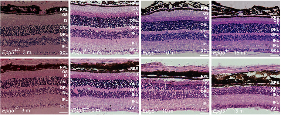 图:Epg5基因敲除小鼠视网膜外核层和感光细胞层随年龄逐渐退化。
