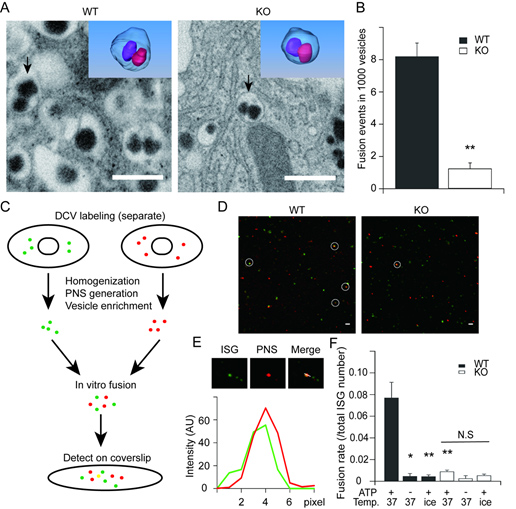 徐涛课题组之前的研究表明,主要定位于高尔基体的HID-1蛋白在胰岛β细胞等分泌细胞中高表达,并在囊泡的运输和成熟过程中起作用。为了进一步研究该蛋白的生理功能,研究人员构建了胰岛β细胞特异性敲除Hid-1基因的小鼠模型。HID-1敲除小鼠表现出明显的糖耐量异常,其胰岛素分泌不足并且胰岛素原的剪切存在严重缺陷。同时,电镜分析发现,该小鼠胰岛β细胞中致密核心囊泡的致密程度不足,直径偏小。进一步的体外实验证明, HID-1蛋白是胰岛素囊泡的同型融合过程的重要参与者,HID-1蛋白的缺乏直接造成同型融合受阻,并且抑制胰岛素囊泡酸化的过程。该研究表明 HID-1是一个全新的、能够直接影响胰岛素囊泡成熟的蛋白,首次在动物模型上证明了同型融合对于胰岛β细胞释放胰岛素有重要意义。