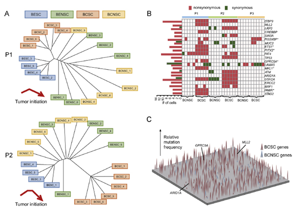 图示:膀胱癌单细胞水平的系统进化分析。图A:膀胱癌干细胞与膀胱癌非干细胞的进化分析。图B:体细胞突变关键基因。图C:单个细胞体细胞突变频率。