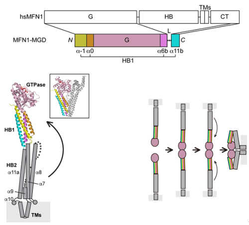 线粒体是高度动态变化的细胞器,在细胞内不断地进行分裂和融合。MFN家族蛋白位于线粒体外膜,是一类发动蛋白(dynamin)超家族成员,在介导线粒体同源膜融合过程中发挥重要作用,MFN1或2的缺失导致小鼠胚胎致死,MFN2的突变与人类的神经退行性疾病CMT2A有密切关联,但是MFN的作用机制还知之甚少。遗憾的是,MFN虽已被发现近二十年,但由于难以表达纯化,其机制研究一直没有进展。