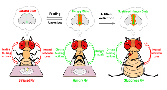 黑腹果蝇(Drosophila melanogaster)是经典的模式动物,生命科学史上许多重要分子都是先在果蝇中发现并明确其功能的。从生物特性上看,果蝇基因组小,脑神经元数量少,而且生活周期短;果蝇研究还具备便利的遗传操作手段,因此果蝇是研究行为相关的分子和神经机制的首选模型。果蝇的代谢相关分子机制也和哺乳动物较相似,但是进食调控及神经环路是否也类似,并没有得到证实。果蝇能否作为研究神经调控机体能量平衡的模式动物呢?