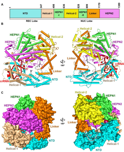 图注:LshC2c2-crRNA的二元复合物的晶体结构。