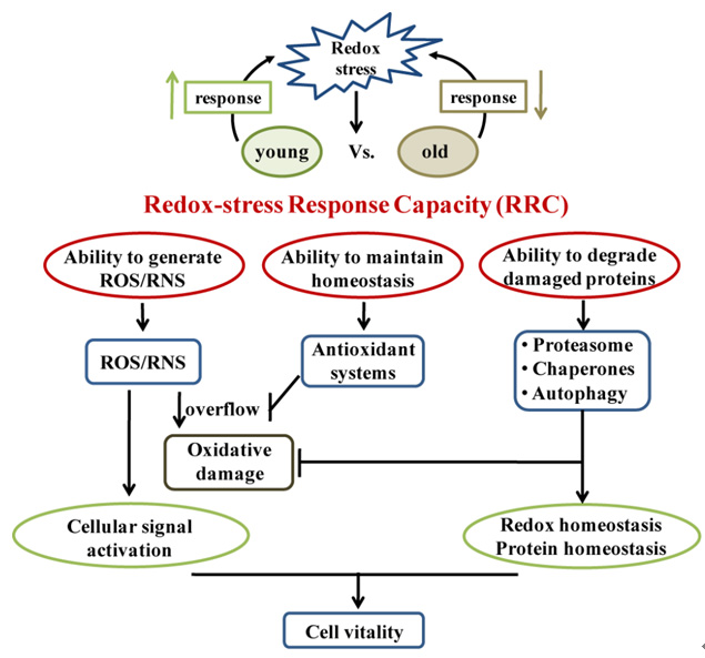 衰老与多种疾病密切相关,包括癌症、心血管疾病、糖尿病以及神经退行性疾病等,因此抗衰老或健康衰老是一个迫切需要解决的重要科学问题。衰老与氧化还原密切相关。传统的自由基衰老学说认为氧化应激是对细胞的一种损害,是导致衰老的一个重要因素。大多数关于氧化还原和衰老的研究主要集中在静息状态活性氧(reactive oxygen species, ROS)的高低。很少有研究去比较年轻和衰老个体对于氧化还原刺激的动态反应能力。金沙集团1862cc陈畅教授提出了“氧化还原应激反应能力(RRC)”的新概念,并证明这种动态反应能力的下降是衰老的一个本质特征。这篇题为“The decay of Redox-stress Response Capacity is a substantive characteristic of aging: Revising the redox theory of aging” 的研究论文于2016年12月28日在线发表在Redox Biology杂志上。