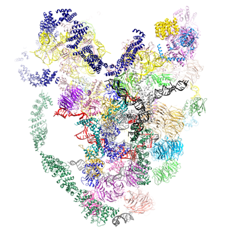 核糖体是由RNA和大量蛋白质构成的大型分子机器,负责地球上所有生物的蛋白质合成。在真核生物中,核糖体组装是个非常复杂的过程。核糖体在成熟过程中需要和大量的组装因子暂时结合,形成了一系列核糖体前体复合物。小亚基核糖体在组装过程中形成两个主要的中间体:早期的90S和晚期的pre-40S前体。90S前体是个巨大的复合物,除了含有核糖体RNA和蛋白质组分,还含有约50个非核糖体蛋白质和U3 snoRNA,分子量高达5百万道尔顿。