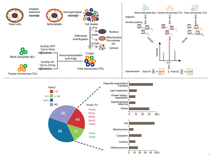 胡俊杰课题组用酿酒酵母作为实验材料,选用管状内质网上所特有的已知蛋白作为靶蛋白,用免疫沉淀的方法分离、纯化了管状内质网膜泡组分。后与上海科技大学的水雯箐课题组合作,利用半定量质谱的方法,对管状内质网蛋白质组与全内质网蛋白质组作了系统的分析和比较,发现79个高度富集于管状内质网的蛋白。对这些蛋白的功能分类表明,管状内质网可能在膜泡运输、脂质合成、细胞器间接触和胁迫感知等方面具有重要功能。