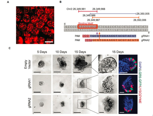 图示:Notch正反馈信号通路调控小肠干细胞自我更新。A, Notch受体在干细胞中的表达;B, 利用CRISPR/Cas9突变Notch受体基因上NICD/RPBJk的结合位点;C, 抑制Notch正反馈信号通路抑制小肠干细胞自我更新。