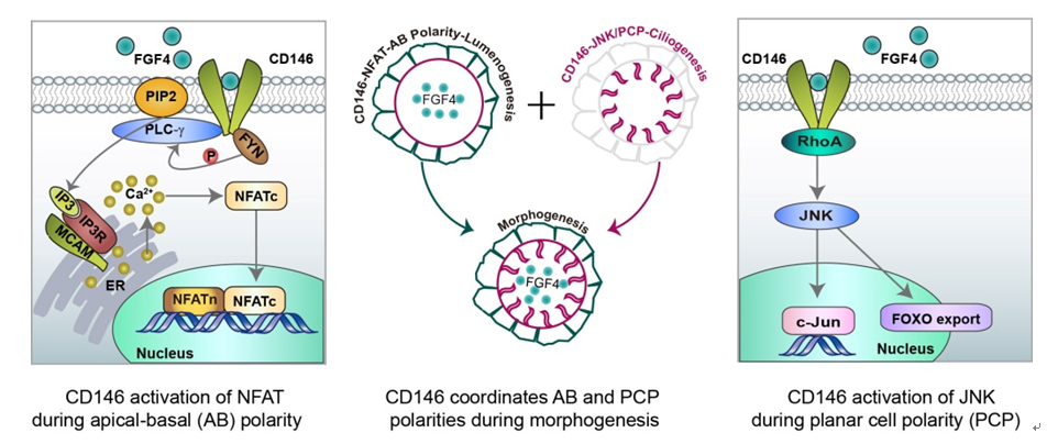 该研究利用斑马鱼作为研究模型,在对CD146(MCAM)在发育中的功能研究中发现:CD146可以同步激活NFAT转录反应和JNK的活性,使细胞的顶底极性和前后极性协调地同步建立、从而在时空上相偶联。该研究还提示,具有催化活性的成型素类分子,可能是顶底极性建立的真正的空间诱因;CD146介导囊泡转运所形成的极性分布,可能是细胞极性形成的最初的启动因子。此外,该研究还发现:CD146的缺失,不仅会导致斑马鱼的胚胎器官Kupffer囊腔的发育异常,而且会引发后续的、全身性的器官左右不对称分布异常。