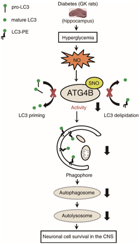 该研究结果揭示了糖尿病中枢神经系统病变的新机制,同时也揭示了调控自噬机器的一种新的翻译后修饰──巯基亚硝基化修饰。