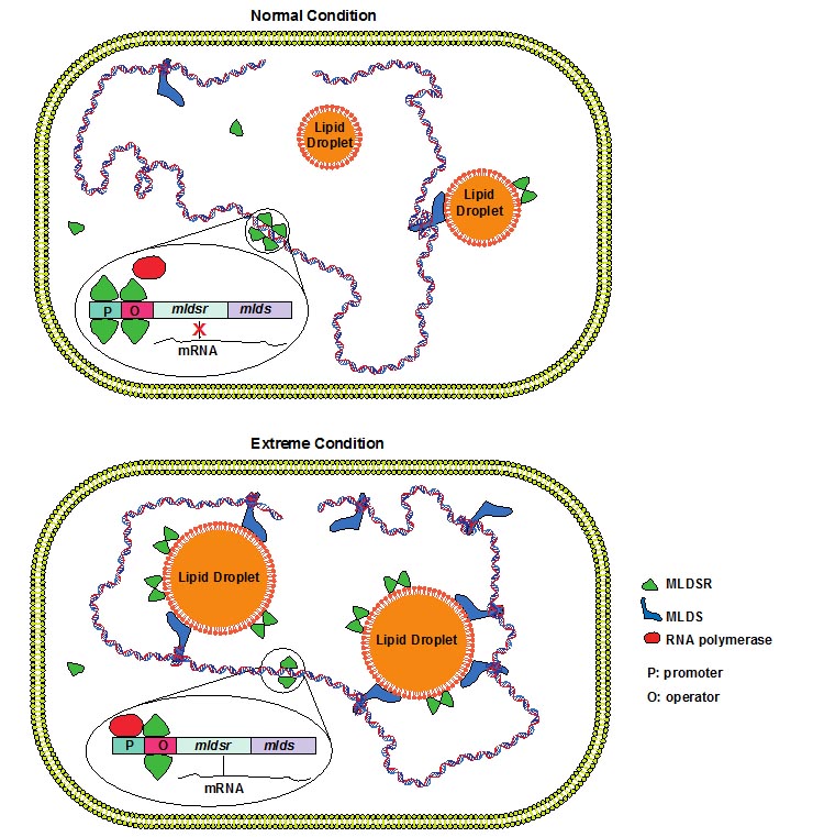细菌脂滴的出现,给细菌提供了一种崭新的、不同于细胞质膜的细胞区隔化方式。刘平生课题组前期工作揭示了细菌脂滴的脂质和蛋白组成,发现了一个控制脂滴大小的蛋白并命名为MLDS。该课题组相关研究最近取得突破性进展,发现并证明了细菌脂滴通过MLDS结合细菌基因组DNA,并在极端环境下保护基因组DNA,从而提高细菌的成活率。在对这一重要生理过程的调控机制研究中,刘平生课题组进一步揭示细菌脂滴不但保护DNA,还通过控制转录因子的有效浓度,参与DNA的转录调控。