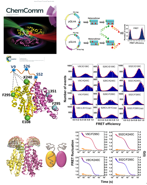 2017年6月19日,英国皇家化学会主办刊物Chemical Communications(ChemComm)以封面论文(Inside Front Cover)的形式在线发表了中科院生物物理研究所柯莎(Sarah Perrett)研究组题为“A Co-expression Strategy to Achieve Labeling of Individual Subunits within a Dimeric Protein for Single Molecule Analysis”的文章,论文报道了一种基于共表达的方式获得异二聚体蛋白,以实现对二体蛋白中某一单体上进行位点特异性荧光标记的方法,该方法可应用于二聚体蛋白构象及动力学机制的单分子FRET研究。