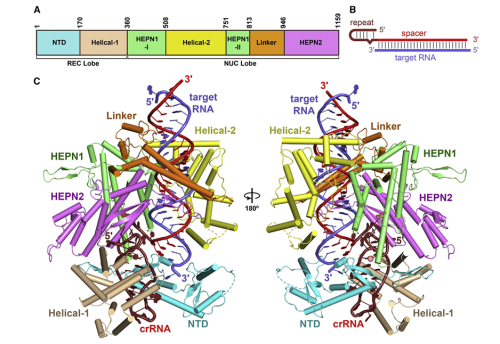 图注:LbuCas13a-crRNA-target RNA三元复合物的晶体结构。