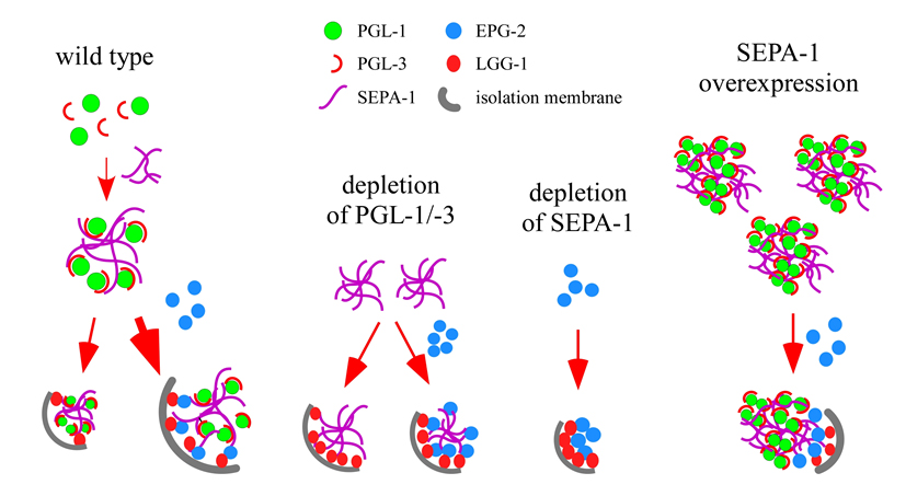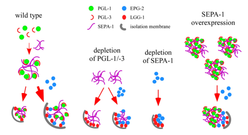 前期课题组发现秀丽隐杆线虫胚胎发育过程中PGL颗粒组分PGL-1和PGL-3(cargo)被自噬选择性降解。进一步研究发现P颗粒组分的降解过程是通过受体蛋白SEPA-1(receptor)和支架蛋白EPG-2(scaffold)介导的。而且受体蛋白SEPA-1和支架蛋白EPG-2最终也被自噬降解。在该研究中,我们深入研究了PGL颗粒的组成对自噬降解效率的影响。研究发现PGL-1和PGL-3的缺失可以促进SEPA-1和EPG-2的降解,并且SEPA-1的缺失可以促进EPG-2的降解。同时我们还研究了不同种类的蛋白质聚集体之间的关系,发现过表达PGL颗粒或者是SQST-1(线虫中p62的同源蛋白)聚集体,不会对另外一类蛋白质聚集体产生明显的影响。综合上述现象,我们认为蛋白质聚集体的降解受到组分的影响,并且受到多种水平的调节。