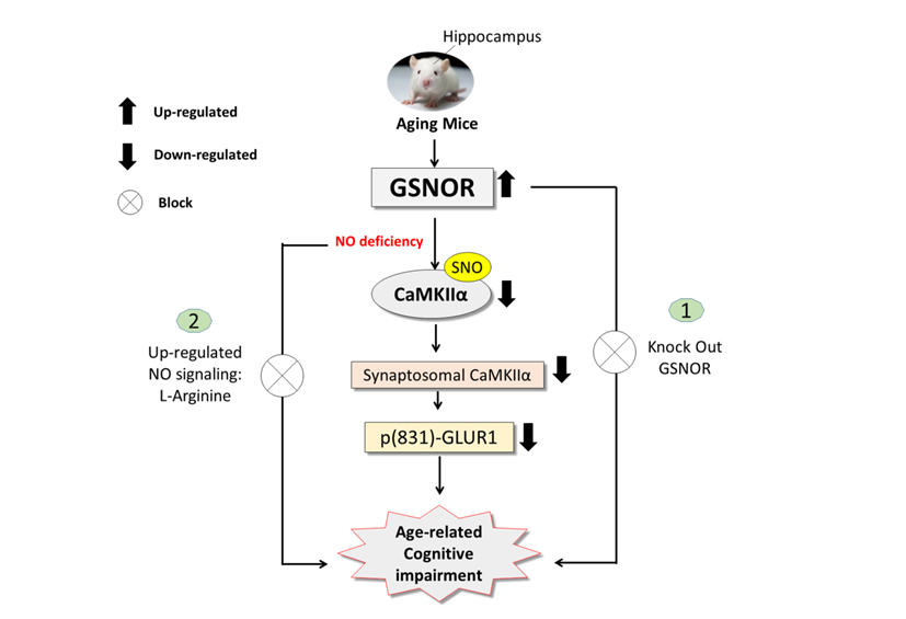 陈畅课题组研究发现,在衰老人群和小鼠的海马组织中GSNOR的表达水平随年龄显著增加。神经元特异性高表达GSNOR的转基因小鼠学习记忆能力明显缺陷,海马脑片长时程增强损伤以及海马神经元树突棘密度降低。在自然衰老小鼠(22月龄)中敲除GSNOR可以增强衰老小鼠的认知功能以及海马脑片长时程增强作用。进一步通过亚硝基化修饰定量蛋白质组学分析自然衰老小鼠海马中亚硝基化修饰水平的变化,发现认知功能关键蛋白CaMKIIα的亚硝基化修饰水平在衰老海马中明显降低。我们在海马神经元中确定了GSNOR对于CaMKIIα的亚硝基化修饰水平的调控以及GSNOR可以通过降低海马区CaMKIIα的亚硝基化修饰下调其在突触小体中的积累,同时抑制下游谷氨酸受体GLUR1(S831)磷酸化修饰。另外,实验证明通过补充NO信号通路可以挽回神经元特异性高表达GSNOR诱导的学习记忆损伤。