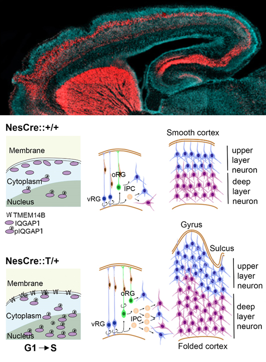 王晓群课题组在此工作基础上,通过与汤富酬课题组和张军课题组的合作,利用单细胞深度测序技术筛选出了人脑oRG细胞特异表达的基因TMEM14B。条件性过表达TMEM14B在小鼠的神经系统中促进小鼠大脑皮层多种神干细胞亚型数量的增多。小鼠出生后表现出大脑皮层表面积变大、皮层增厚的现象,并伴有有沟回的形成。研究发现TMEM14B作为一个膜蛋白,通过调节结合蛋白IQGAP1的磷酸化水平来促使IQGAP1蛋白入核,从而加速了神经干细胞的分裂周期。我们的研究不仅揭示了神经干细胞oRG的特征分子,也阐明了大脑皮层增大增厚以及折叠的细胞和分子机制。